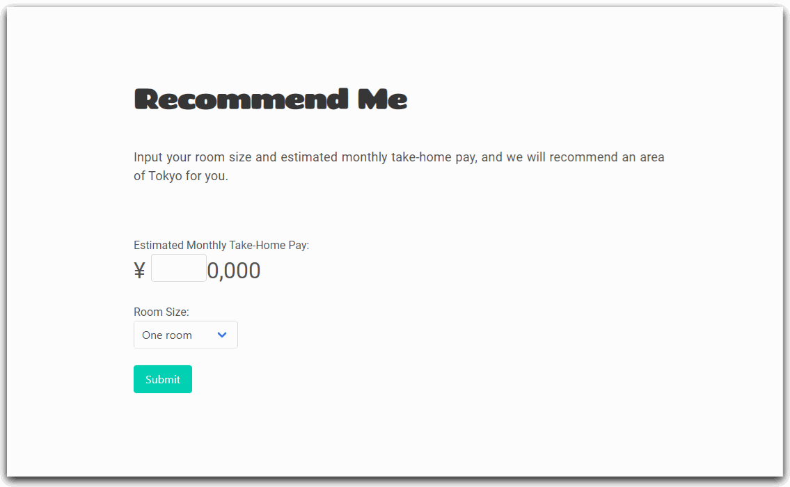 Recommendations use an estimated salary and room size to recommend an area that falls close to 30% of the user's monthly intake.