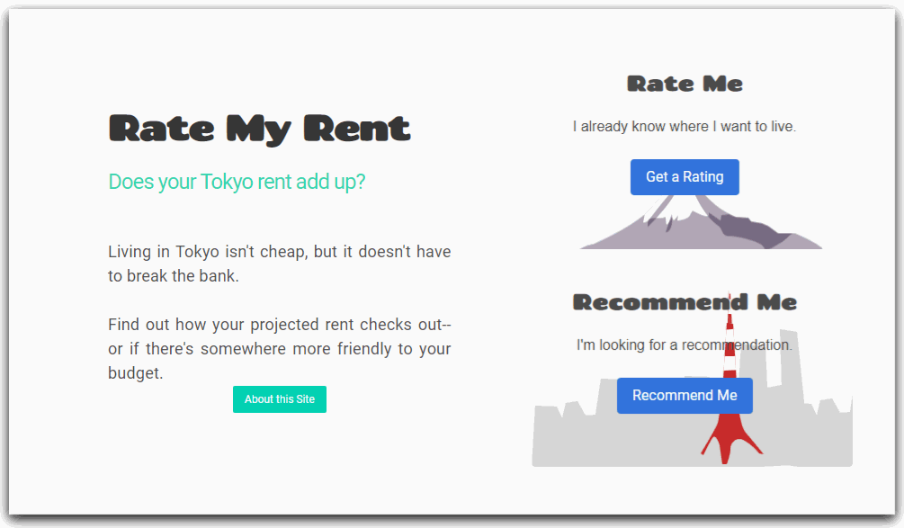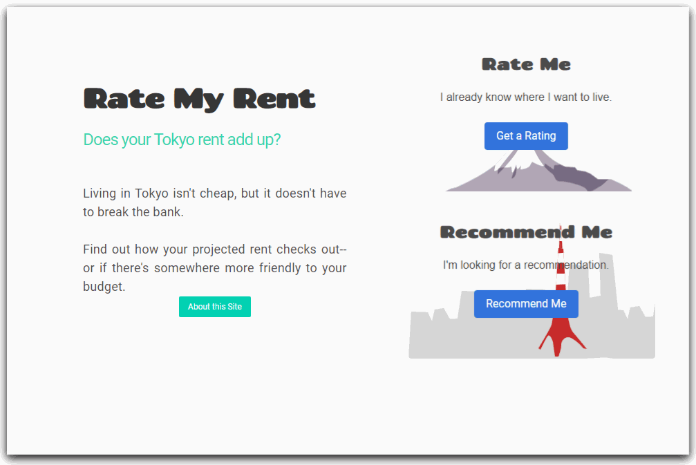 Ratings are based on an assumption of 30% of a user's estimated salary being an ideal percentage to use towards rent, with deviations from that rated accordingly. Data for average rent by area and room size was sourced from Suumo.